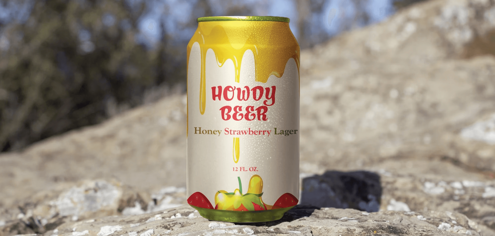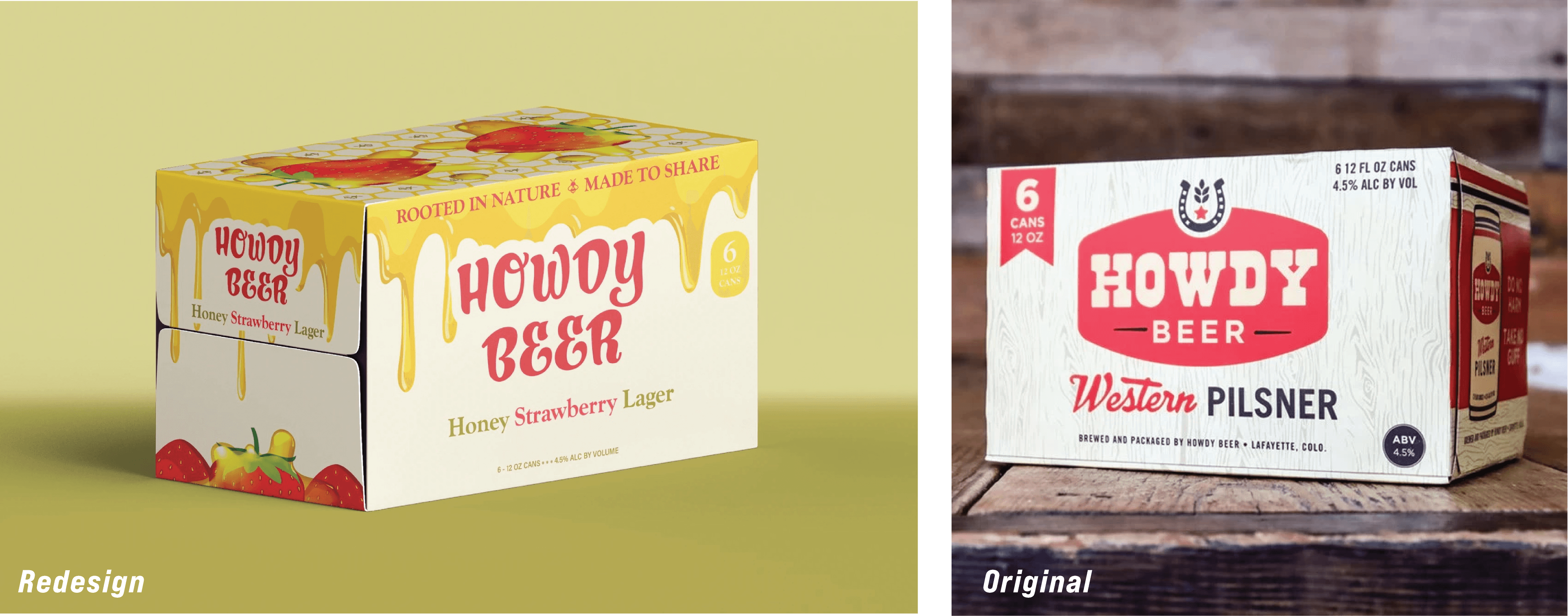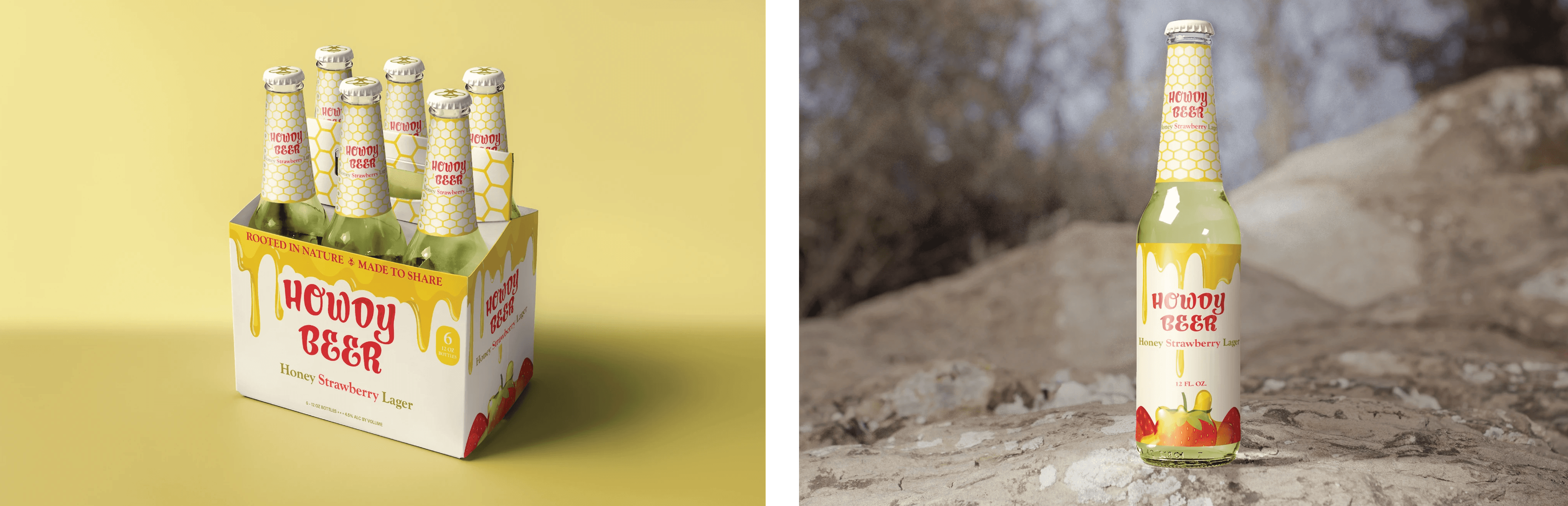 This Howdy Beer packaging refresh reimagines the brand for cottagecore Millennials, shifting from a Western cowboy aesthetic to one rooted in comfort, nature, and slow living. I conducted audience research and developed all design assets, redesigning the original box and extending the system across cans and bottles. Inspired by honey and strawberries, the identity uses warm tones and a dripping honey motif layered over fruit illustrations to create a nostalgic, handcrafted feel, resulting in a cohesive packaging system that emphasizes authenticity and connection to nature.