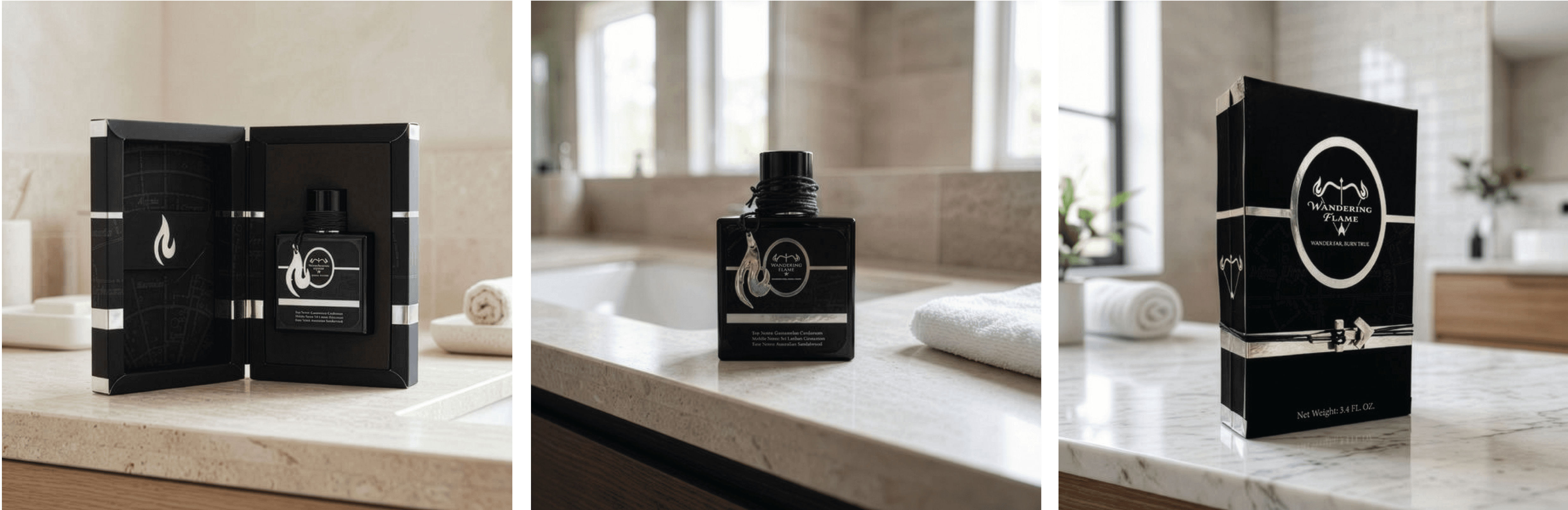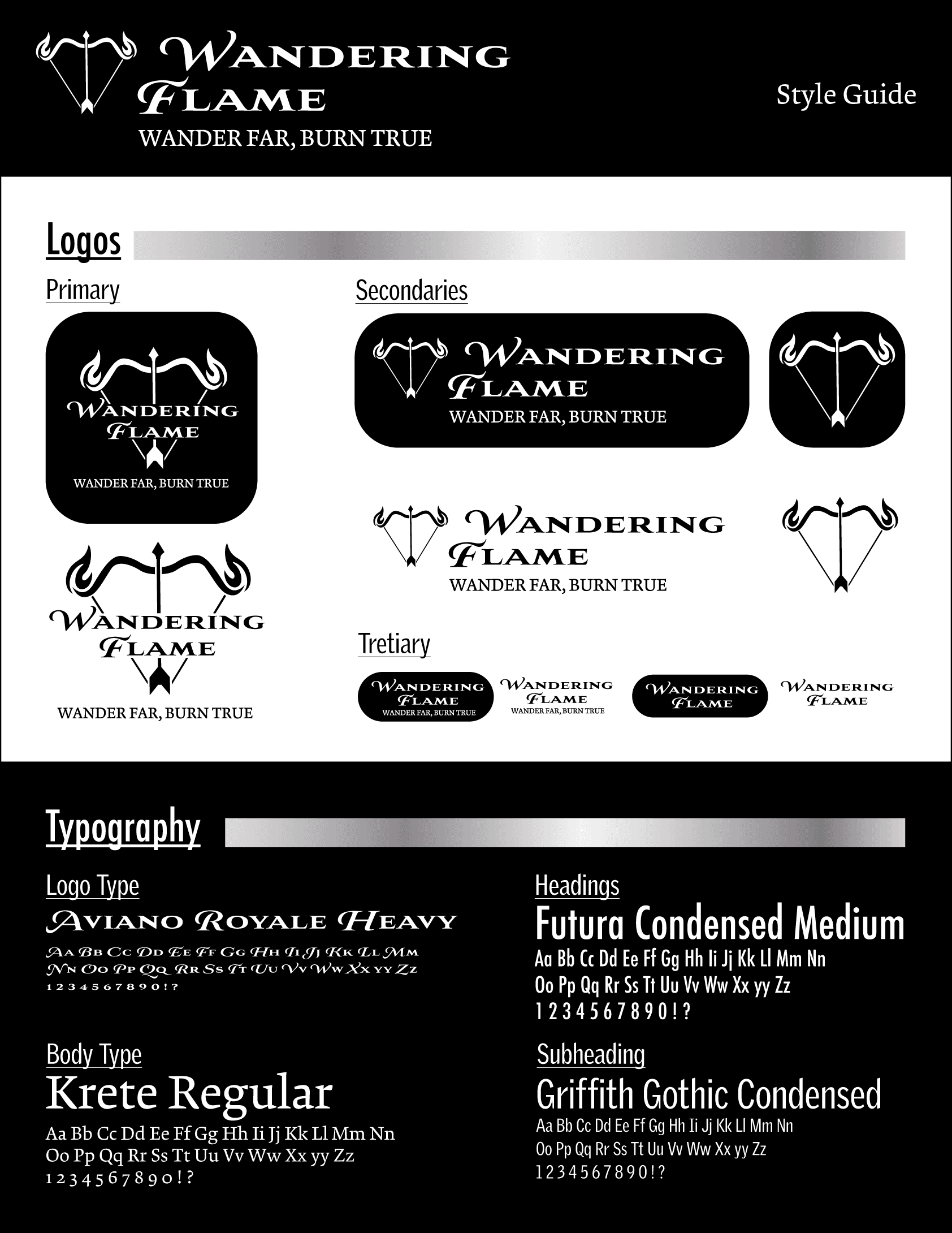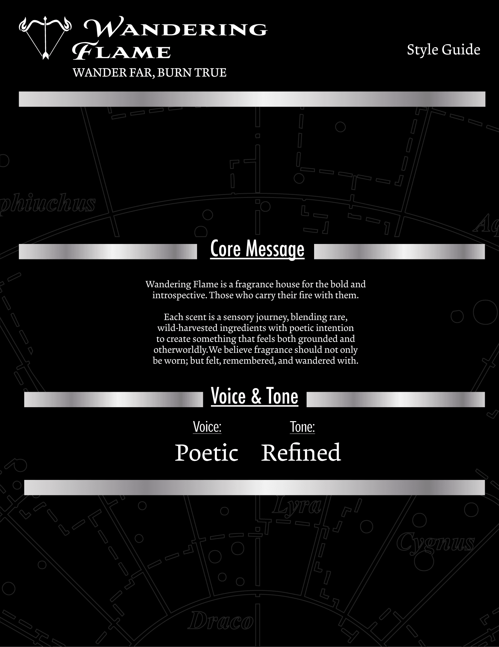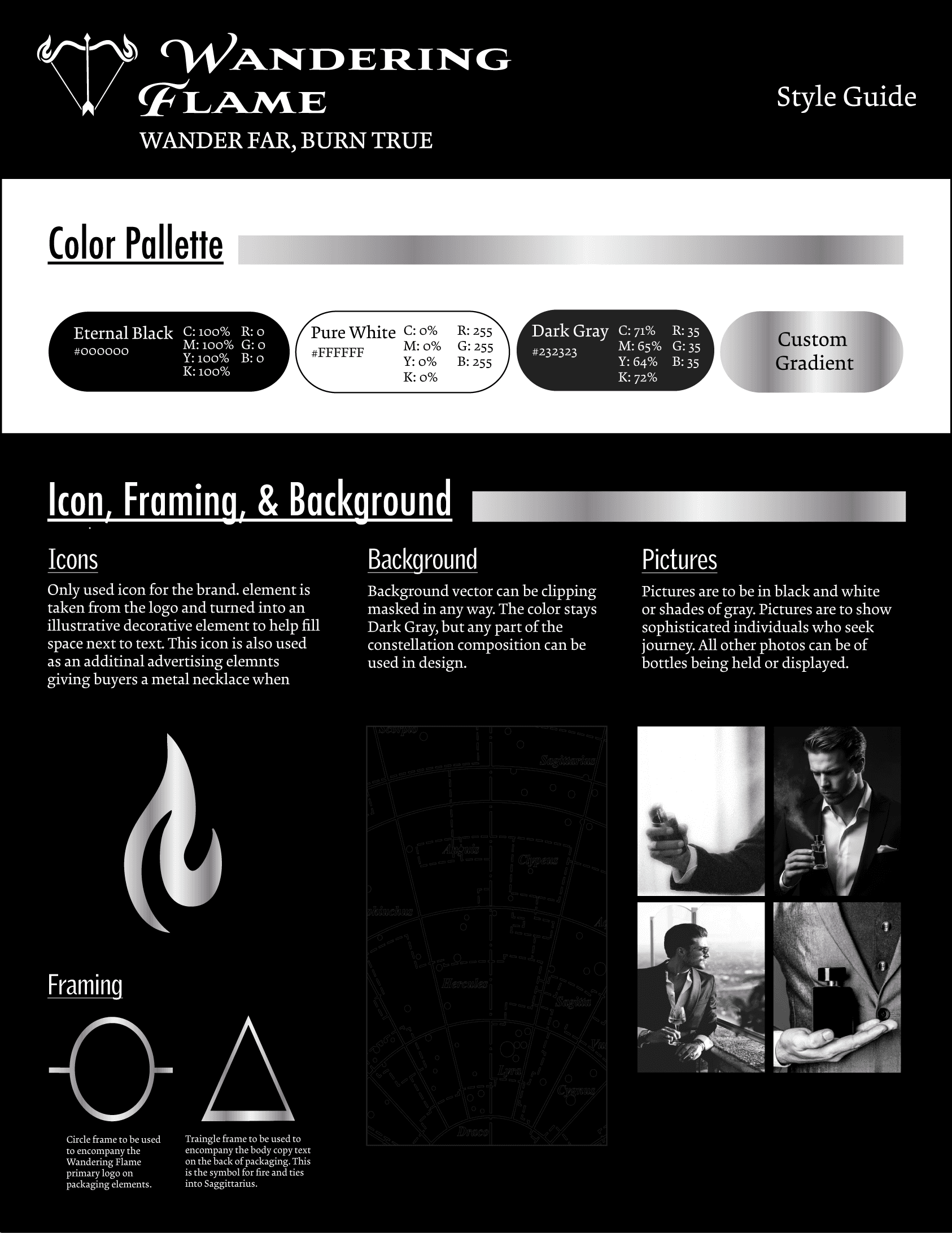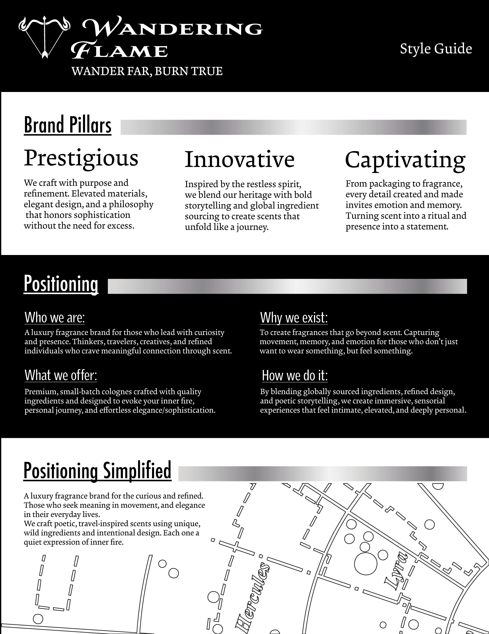 Wandering Flame is a high-end cologne inspired by the Sagittarius zodiac sign. I developed the packaging, social media content, and style guide to capture a sleek, celestial aesthetic through a black, white, and silver palette with subtle astrology-inspired linework. Centered around the Sagittarius arrow motif, the brand was built to reflect luxury and refinement, appealing to discerning consumers such as creative directors, law partners, and actors.